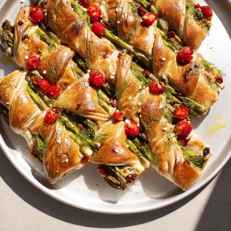 The lattice is easier than it looks once you stop overthinking it—the key is consistent spacing from the start so your grid looks intentional rather than accidental. I usually measure with my fingers, which sounds imprecise but somehow always works, and I've found that working on a cool platter helps the asparagus stay firmer while you're arranging. The rhythm of the weaving becomes meditative if you let it, and by the end, you'll have developed a tiny skill that feels almost magical to watch come together.