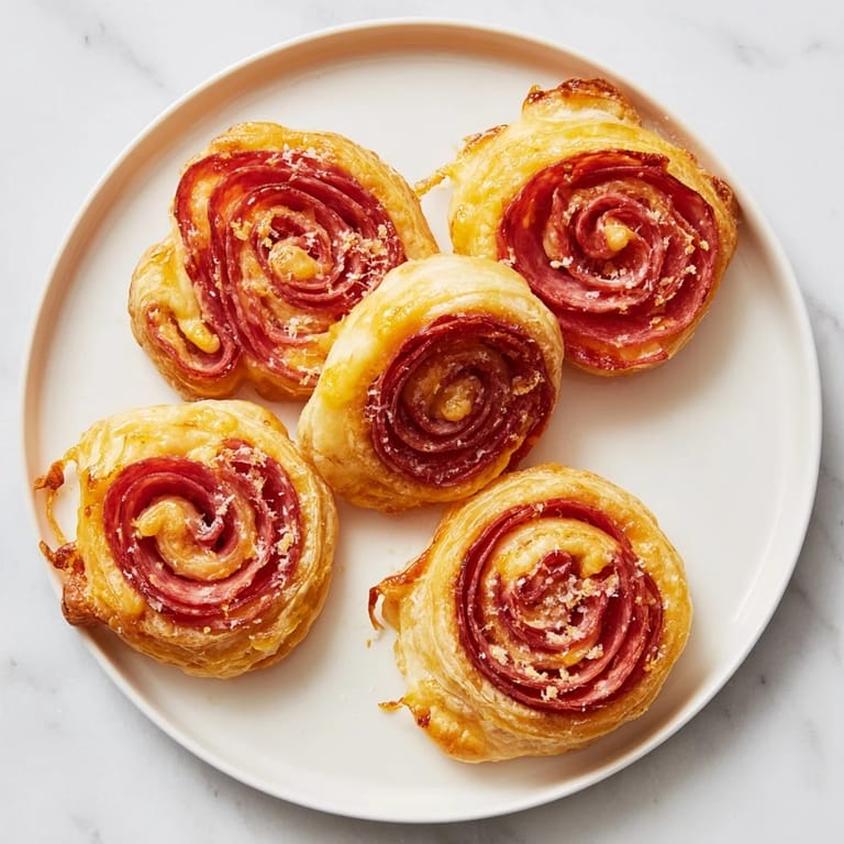 Save Buttery, golden pastry scrolls filled with sharp cheddar and savory salami—perfect for parties or snacking.