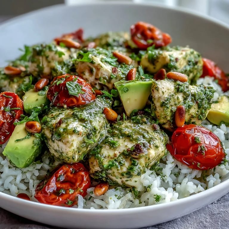 Save There's something about the way pesto transforms ordinary chicken that caught me off guard the first time my neighbor handed me a jar of her homemade version and said, "Just trust me on this." I'd always played it safe with marinades, but watching that vibrant green coat the chicken pieces like liquid emerald changed everything. Now whenever I need a meal that feels both impressive and effortless, this bowl comes together in my kitchen like muscle memory. The combination of tender, fragrant chicken over fluffy rice with vegetables that still have their snap is exactly what I crave when I want something nourishing without the fuss.