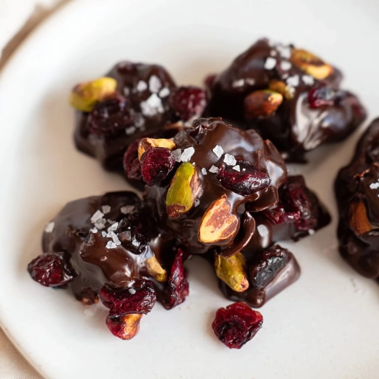 Save Elegant, bite-sized clusters combining roasted pistachios and tart dried cranberries, bound with smooth dark chocolate for an irresistible gourmet snack.