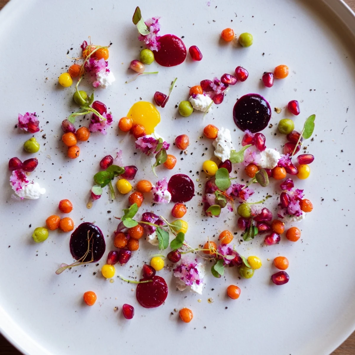 - Now carefully sprinkle the diced pickled onions, scatter microgreens like you're placing them individually, and dust the sesame seeds and pomegranate seeds over and around your dots. Add edible flowers last if using—they're fragile and should be the final gesture. Think of yourself as placing each element with tweezers, even if you're using your fingers.